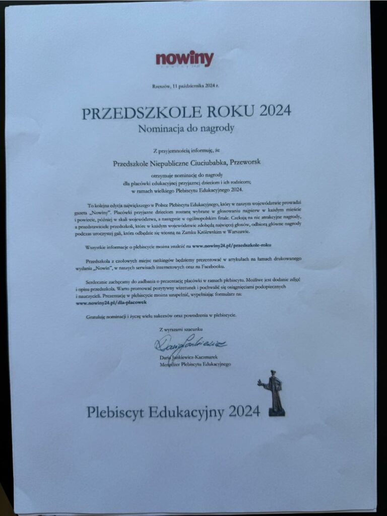 Drodzy Państwo, Bardzo miło nam ogłosić, że nasze przedszkole zostało nominowane do nagrody ,,Przedszkole Roku 2024″ w ramach wielkiego Plebiscytu Edukacyjnego 2024.