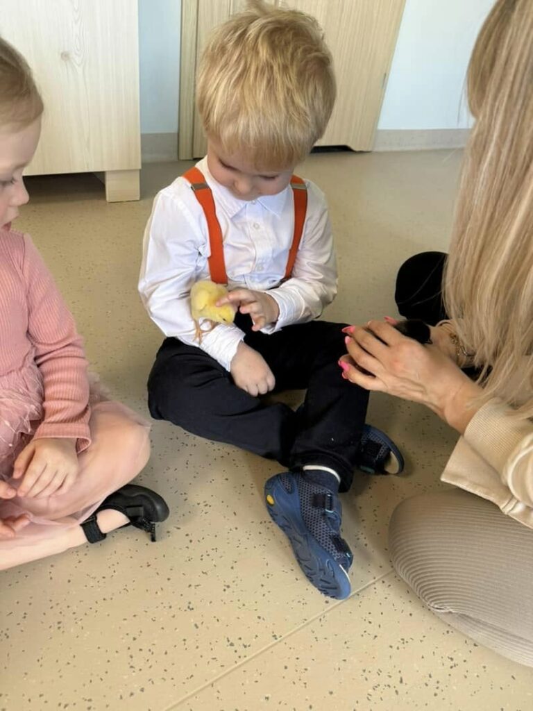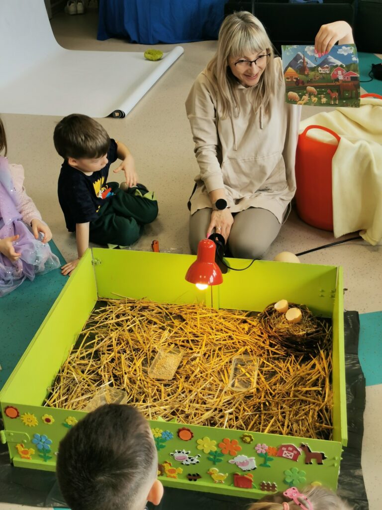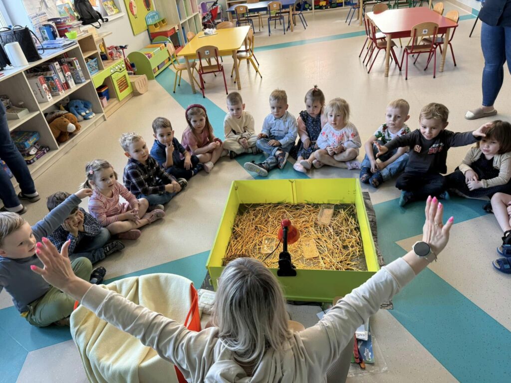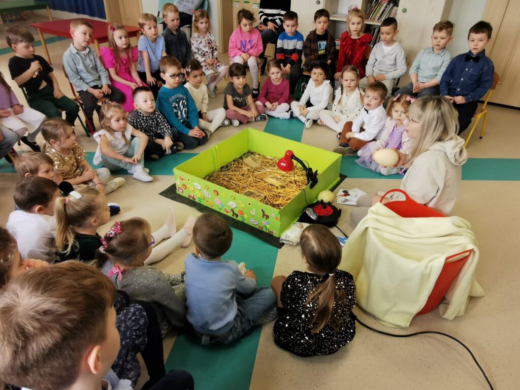 Spotkanie było nie tylko pełne radości, ale również edukacyjne – przedszkolaki poznały cykl rozwoju kurczaka, miały okazję delikatnie pogłaskać pisklaczki oraz zadać mnóstwo ciekawych pytań. To była doskonała okazja do rozwijania wrażliwości, empatii i szacunku do zwierząt.