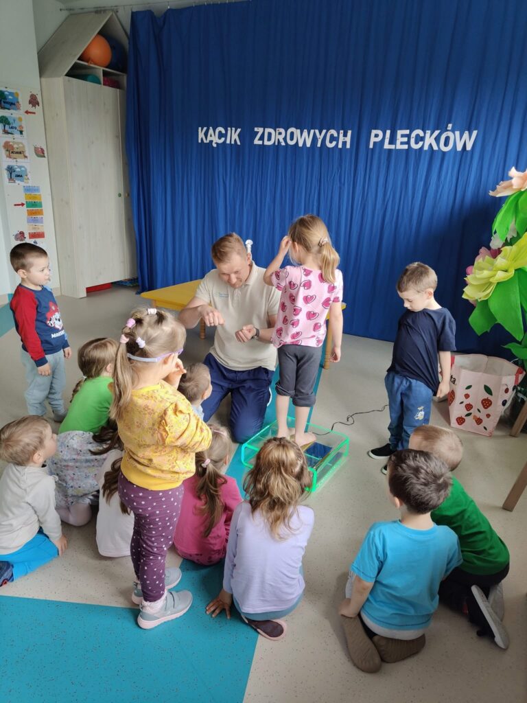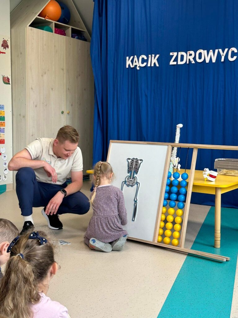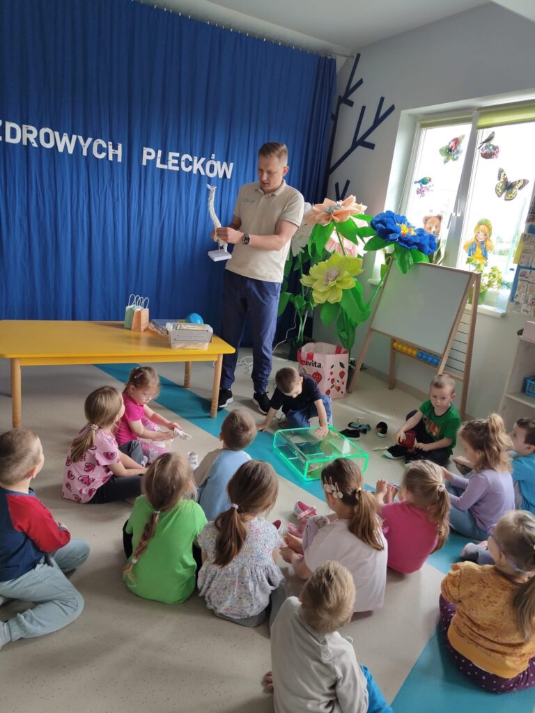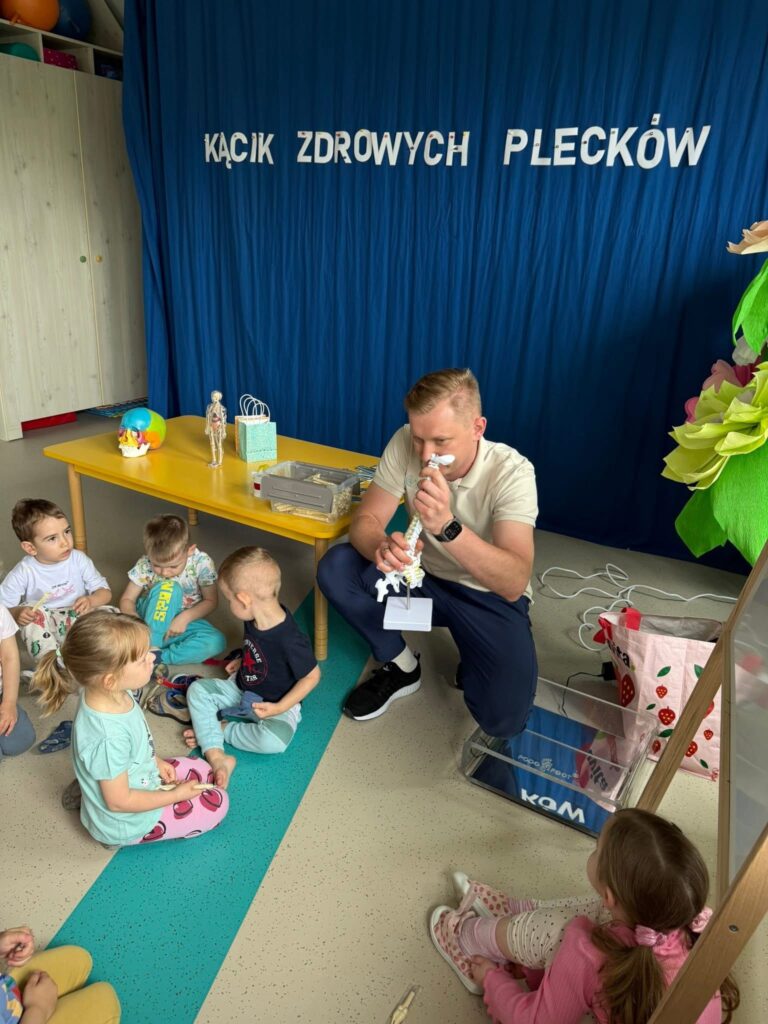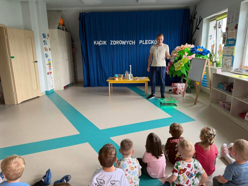 W minionym miesiącu nasze przedszkole odwiedził wyjątkowy gość – fizjoterapeuta, a prywatnie tata Jagódki z grupy biedronek. Podczas spotkania dzieci miały okazję dowiedzieć się, na czym polega praca fizjoterapeuty, dlaczego ruch i prawidłowa postawa są tak ważne dla zdrowia oraz jak dbać o swoje ciało każdego dnia.