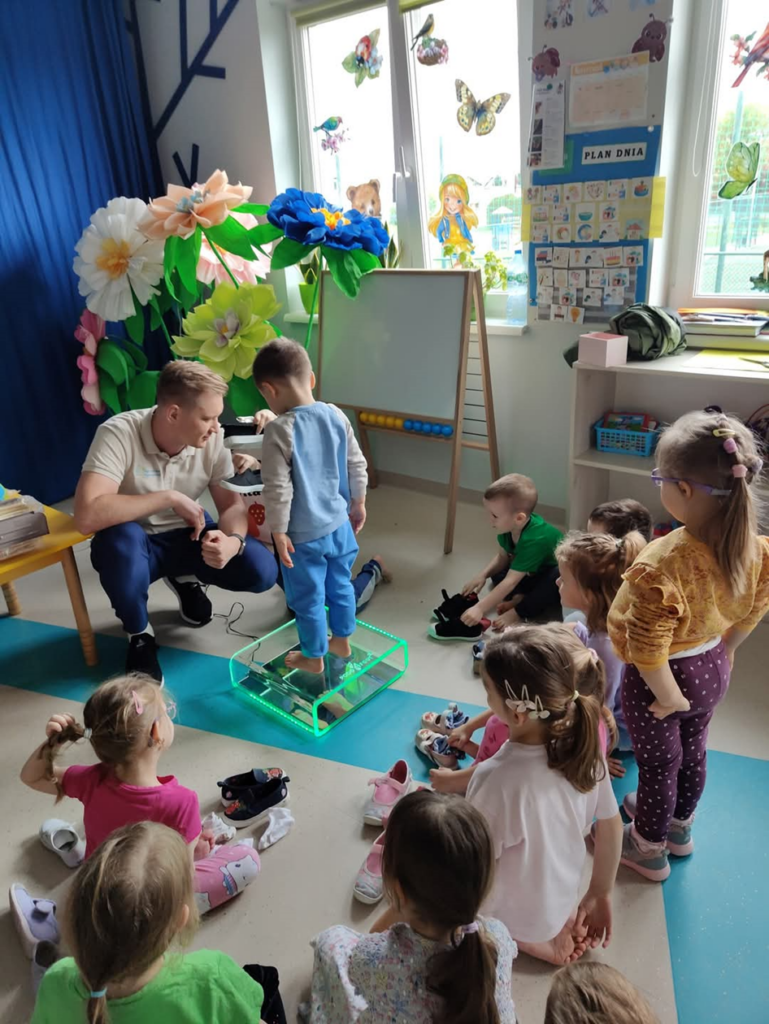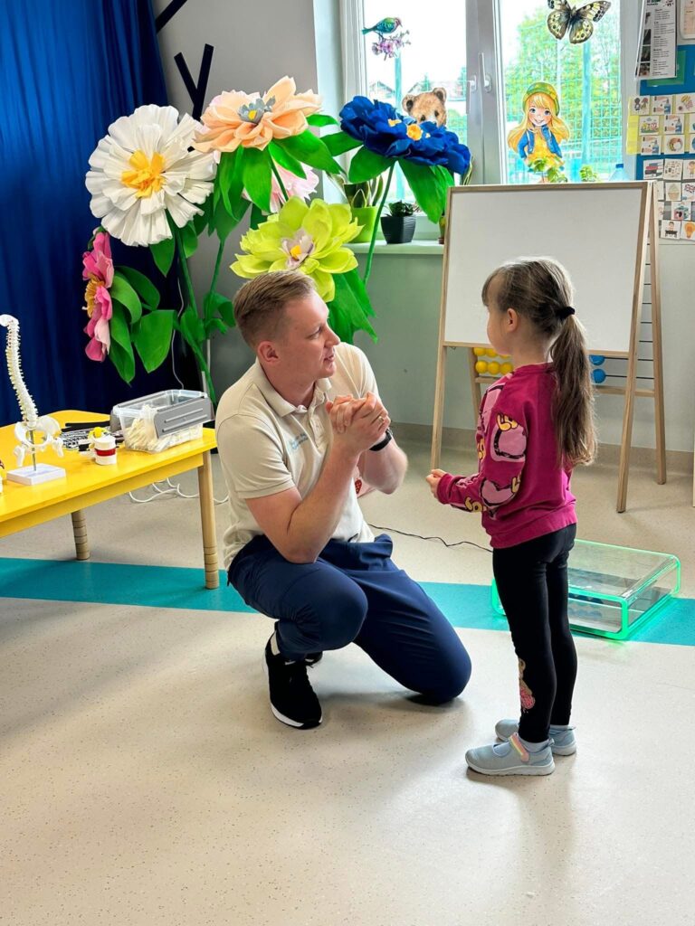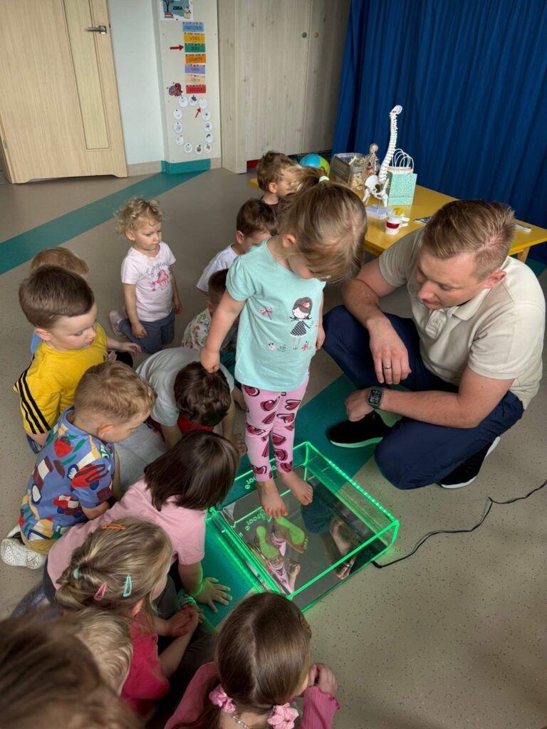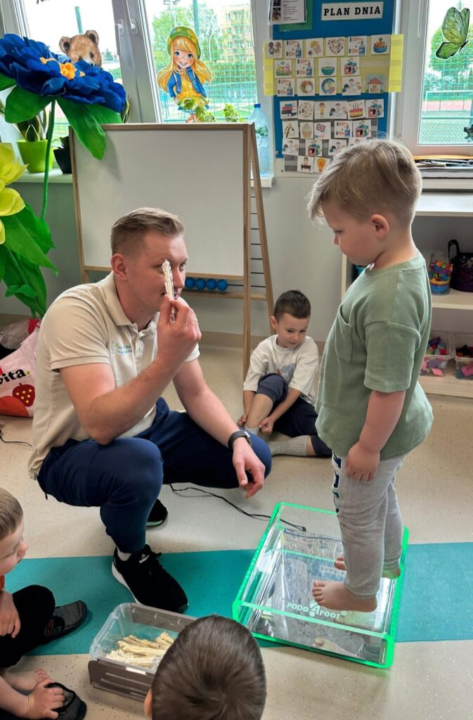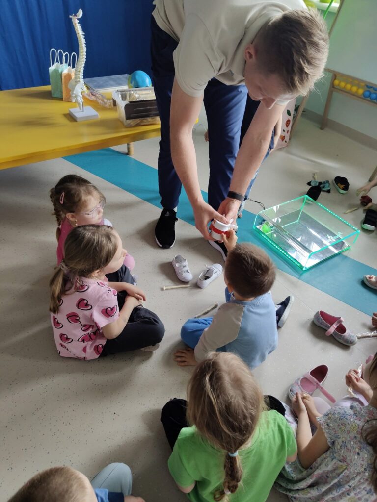 W minionym miesiącu nasze przedszkole odwiedził wyjątkowy gość – fizjoterapeuta, a prywatnie tata Jagódki z grupy biedronek. Podczas spotkania dzieci miały okazję dowiedzieć się, na czym polega praca fizjoterapeuty, dlaczego ruch i prawidłowa postawa są tak ważne dla zdrowia oraz jak dbać o swoje ciało każdego dnia.