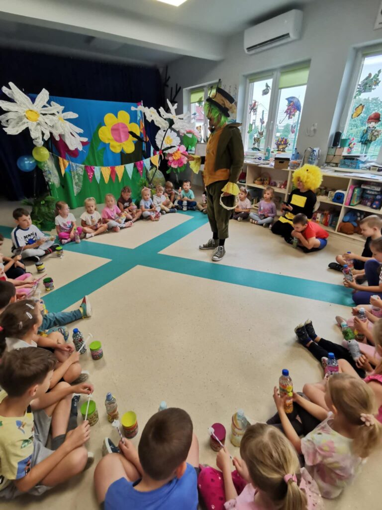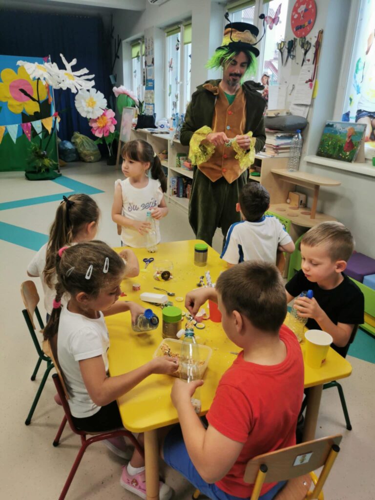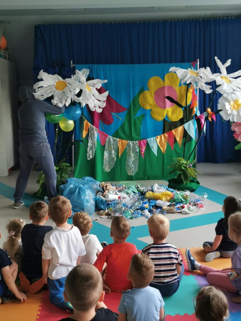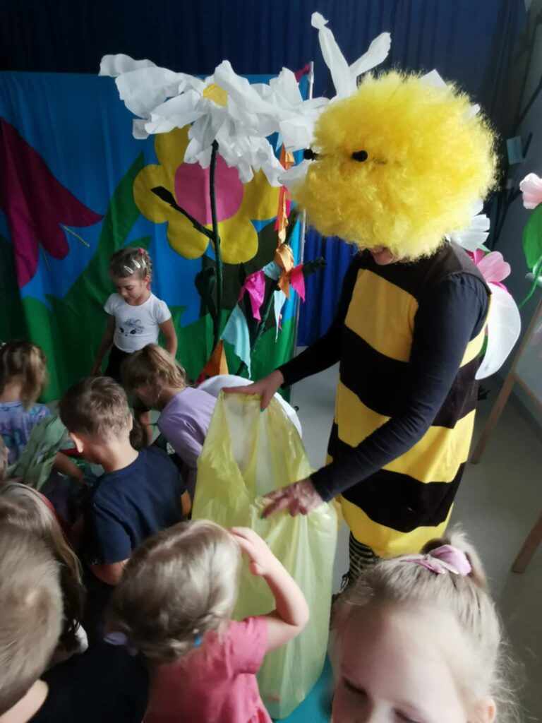 Podczas przedstawienia słychać było wesołe piosenki o ekologii i pięknym świecie. Przesłanie teatru było jasne – dbajmy o nasza planetę! Na koniec dzieci na warsztatach zrobiły instrumenty – grzechotki i bębenki, oraz wspólnie zagrały.