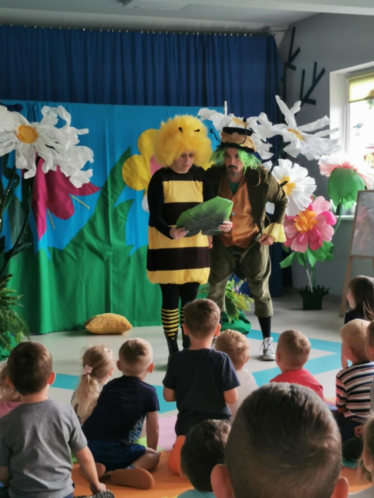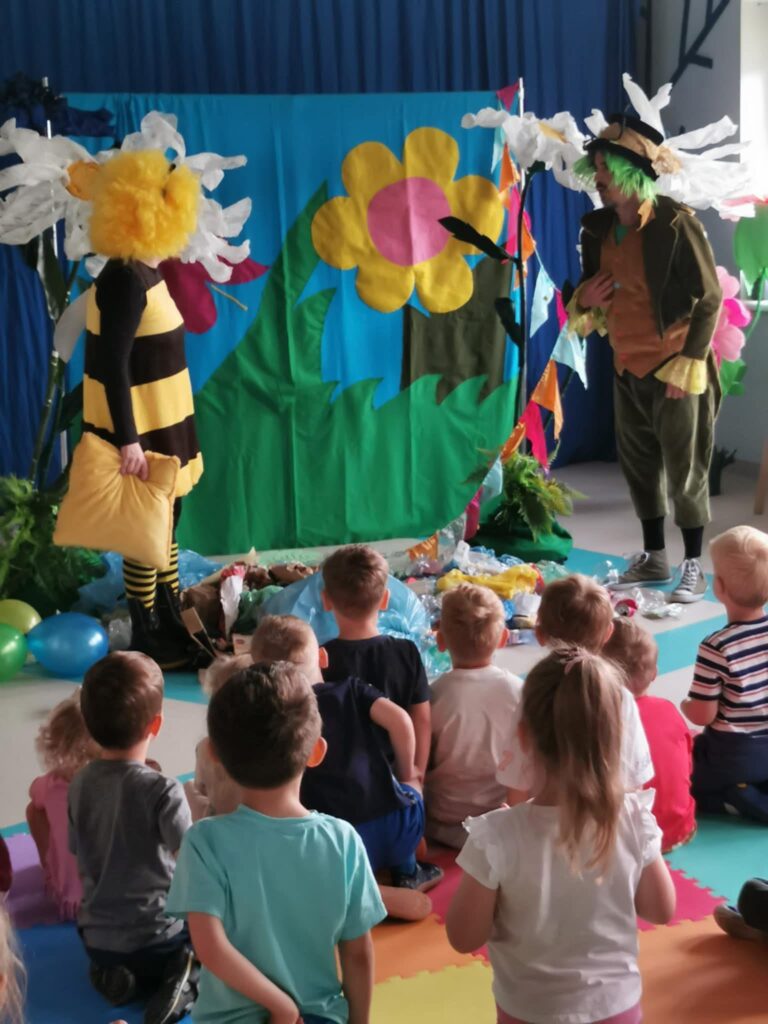 Spektakl odbywał się na tle kwiecistej, kolorowej dekoracji przedstawiającej łąkę. Dzieciom od razu spodobał się ten kolorowy świat. Bohaterowie cieszyli się piękną łąką, świeżym powietrzem i zapachem kwiatów, ale pewnego dnia ich spokój przerwał człowiek, który wyrzucił tam śmieci. Zmartwili się, że zagraża to mieszkańcom. Wtedy wspólnie postanowili działać! Razem z mrówkami – dziećmi, bohaterowie nauczyli się segregować odpady do odpowiednich kolorowych worków.