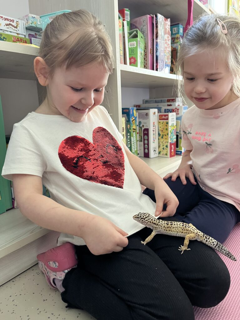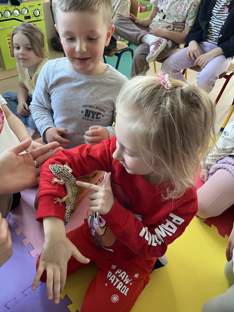 Najwięcej emocji pojawiło się jednak w chwili, gdy poznaliśmy małego gościa – gekona lamparciego! 🦎💛 Ten uroczy przyjaciel wzbudził ogromny zachwyt, radość i ciekawość. Możliwość zobaczenia go z bliska była dla dzieci prawdziwą atrakcją! 🤩✨