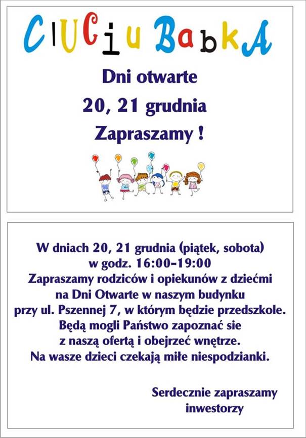 Wszystkich rodziców zapraszamy do przeczytania relacji z rozpoczęcia działalności przedszkola, na stronie Urzędu Miasta Przeworsk. Link: http://www.przeworsk.um.gov.pl/aktualnosci/2913-ciuciubabka-zaprasza-najmodszych-mieszkacow-przeworska